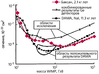 Предсказываемая величина сезонного изменения всего »5%, так что обнаружить эффект нелегко, тем более он в значительной степени может быть затенен сезонными вариациями собственного фона детектора за счет различных внешних факторов. Тем не менее недавно коллаборация DAMA [12] декларировала обнаружение годовых модуляций WIMPs, которые интерпретируются как результат упругого рассеяния нейтралино с массой около 60 ГэВ и сечением порядка 7·10–42 см2 (рис. 6 и 8).