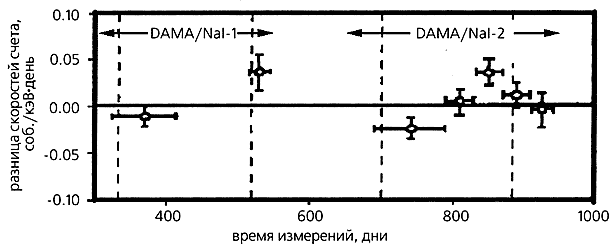 Рис. 6. Результаты эксперимента DAMA по поиску годовых модуляций WIMPs. Скорость счета NaI детекторов в интервале низких энергий в различные времена года приведена в зависимости от текущего времени начиная с 1 января первого года измерений. Вертикальными пунктирными линиями отмечены полугодовые периоды, соответствующие ожидаемым минимумам и максимумам сезонной вариации скорости счета WIMPs.