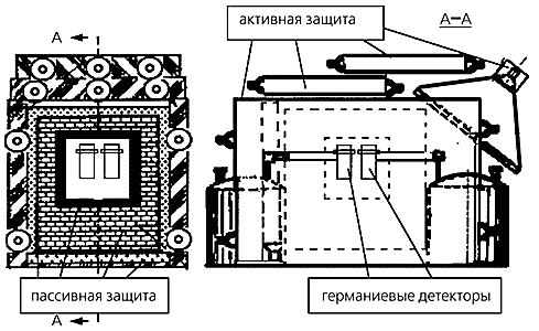 Рис. 7. Комбинированная (пассивная и активная) защита вокруг германиевых детекторов в баксанском эксперименте IGEX-DM.