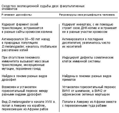 Сходные ряды перевоплощений найдены и у эвкариот. У дрозофилы мобильные элементы семейства gypsy (“цыган”) могут существовать в виде встроенных в хромосому копий; находиться в виде их полных или уменьшенных кольцевых или линейных плазмид в цитоплазме; наконец, в случае отдельных “разрешающих” мутаций в геноме хозяина способны одеться оболочкой, стать настоящими инфекционными ретровирусами и заражать посторонних хозяев через корм. Сходство Р-транспозонов у дрозофилы и эндогенного ретровируса ВИЧ у человека (табл.) позволяет предсказывать возможные эволюционно-генетические события в популяциях человека, судьбу неизбежных сейчас и в будущем его контактов с чужими геномами.