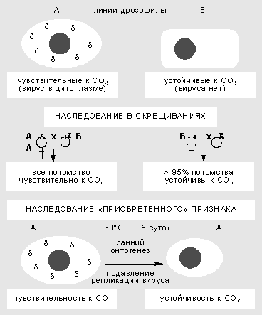 Взаимоотношения генома дрозофилы и размножающегося в ее цитоплазме вируса подчиняются правилам внутриклеточной генетики. Воздействия в ходе онтогенеза могут вызвать сдвиг в числе и межклеточной топографии частиц и как результат - изменить степень чувствительности к углекислому газу. Так, повышенная температура блокирует репликацию вирусных частиц. Если самок и самцов в период гаметогенеза содержать несколько дней при температуре 30°С, потомство от таких мух будет свободно от вируса и устойчиво к СО2. Значит, приобретенный в ходе индивидуального развития признак наследуется в ряду поколений.
