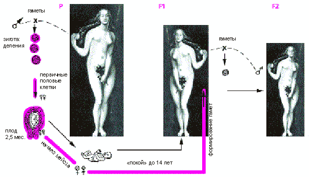 Схема оогенеза в трех последовательных женских поколениях. P - бабушка, F1 - мама, F2 - дочь.