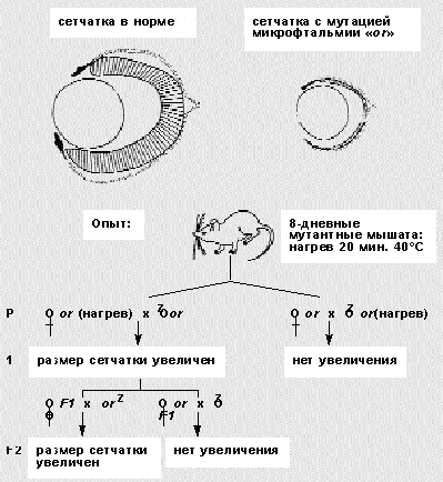 Схема опытов П.Г.Светлова, демонстрирующих передачу в ряду поколений мышей мутации - микрофтальмии. Однократное 20-минутное действие повышенной температуры на мутантных восьмидневных мышат влечет улучшение развития глаз у их потомков (F1 и F2). Этот признак наследуется только по материнской линии и связан с изменением в ооцитах.