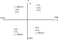 Вычисляют значение румбов согласно схеме, приведенной на следующем рисунке.