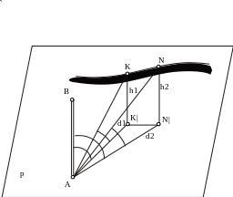основе тахеометрической съемки лежит идея определения пространственного положения точки местности одним наведением зрительной трубы прибора на рейку, установленную в этой точке. Так, положение точек K и N над условной горизонтальной плоскостью P, проходящей через ось вращения трубы прибора, определяется измерением: