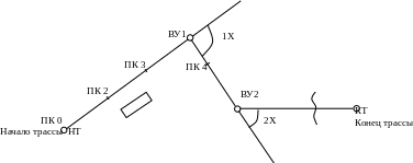 В связи с тем, что на местности имеются какие – либо препятствия (инженерные сооружения, природные препятствия) приходится проектировать трассу, обходя ломаную линию. Обычно при камеральном трассировании намечают несколько углов трассы.