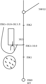 На криволинейном участке трассы через каждые 100 метров закрепляют пикеты (ПК0, ПК1…). ПК0 соответствует НТ. Параллельно с разбивкой пикетажа производят съемку местности в полосе, шириной 200 м под трассой. Результаты съемки заносят в пикетажный журнал, в котором ось трассы показывают в виде прямой линии снизу вверх, на которой отмечают все пикеты и все характерные точки трассы: точки начала кривой середины и