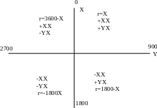 Если используют r, то знаки приращения координат (Х и У) определяют по схеме в зависимости от величины дирекционного угла.