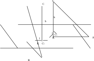 После приведения теодолита в рабочее положение, визируют на точку С и проецируют её на нижнюю часть сооружения, отмечая проекцию штрихом. Проецирование производим при двух положениях вертикального круга. Находим среднее положение проекции (С/). Измеряют расстояние l между центром низа сооружения (К) и центром проекции (С/). Расстояние l измеряют с точностью до 0,001 м. Угловую величину крена можно подсчитать по формуле (18):