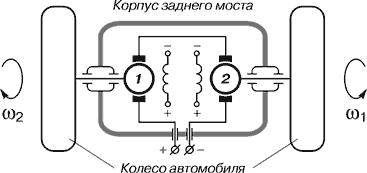 Рис. 2. Дифференциальный движитель постоянного тока в качестве привода автомобиля