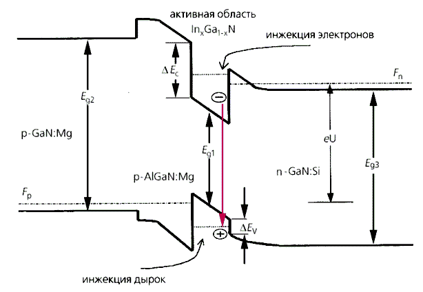 Энергетическая диаграмма p-n гетероструктуры типа InGaN/AlGaN/GaN при прямом смещении U. Черными стрелками показана инжекция электронов и дырок в активную область p-n гетероструктуры. Попадая в узкие и достаточно глубокие ямы, электроны и дырки оказываются запертыми в них. Если активный слой (с узкой запрещенной зоной Eg1) содержит малое количество дефектов, электронно-дырочные пары рекомбинируют с излучением кванта Eg1 (цветная стрелка).