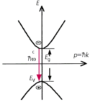 Зависимость энергии электронов от квазиимпульса для прямозонных полупроводников. Стрелкой показан переход электронов из зоны проводимости в валентную, сопровождающийся излучением кванта.