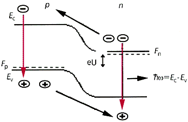 Энергетическая диаграмма обычного (гомогенного) p-n перехода в полупроводнике при прямом смещении U. Черными стрелками показана инжекция электронов и дырок; цветными - рекомбинация электрона и дырки. В отсутствие смещения (U = 0) уровень Ферми (штриховые прямые) одинаков во всем переходе Fp = Fn, и барьеры для основных носителей выше, чем при прямом включении p-n перехода, когда уровни раздвигаются на величину eU = Fn – Fp.