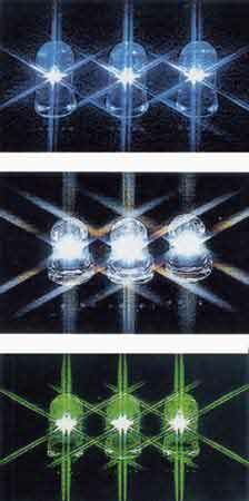 На рубеже 90-х годов наша промышленность выпускала более 100 млн светодиодов в год; мировая - десятки миллиардов. Диоды нашли применение в передаче и визуализации информации: в световых индикаторах, табло, в приборных панелях автомобилей и самолетов, в рекламных экранах. Эффективность излучателя света характеризуется отношением светового потока (в люменах) к потребляемой электрической мощности (в ваттах). Эта величина, называемая светоотдачей, для светодиодов из материалов типа AIIIBV стала больше, чем у ламп накаливания во всех основных цветах видимого диапазона [5].