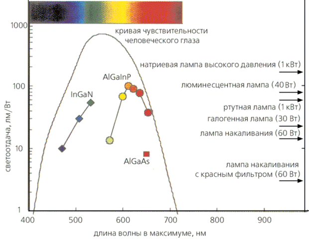 Светоотдача приборов на основе гетероструктур с активными слоями InGaN и AlInGaP на длинах волн, отвечающих максимуму излучения. Стрелки справа показывают светоотдачу вакуумных и газонаполненных ламп; кривая - спектральную чувствительность глаза (кривая видности).