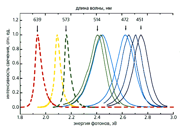 Спектры электролюминесценции светодиодов на основе гетероструктур InGaN/AlGaN/GaN (сплошные линии) и AlInGaP/GaP (штриховые). Видно, что они перекрывают всю область видимого спектра.