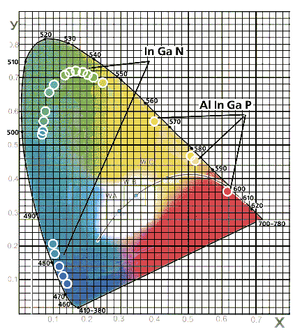 Цветовой график Международной комиссии по освещению. В центре - область белого цвета, пересекаемая дугой, соответствующей цвету черного тела при разных температурах. Кружками отмечены цветовые координаты разных светодиодов.