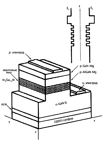 Схема светодиода на основе гетероструктур типа InGaN/AlGaN/GaN с множественными квантовыми ямами.
