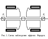 Принципиальная схема устройства для наблюдения и многих применений эффекта Фарадея показана на рис. 1. Схема состоит из источника света, поляризатора, анализатора и фотоприемника. Между поляризатором и анализатором помещается исследуемый образец. Угол поворота плоскости поляризации отсчитывается по углу
