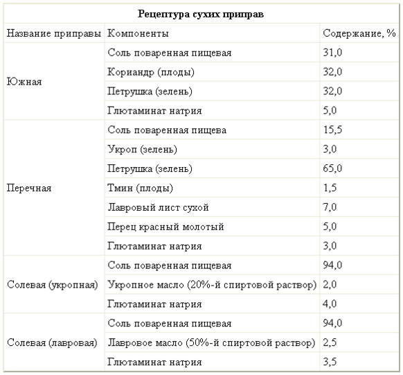 К приправам относятся и овощные маринадные заливки, приготовленные из воды, уксуса, соли и сахара с добавлением различных пряностей или пряной зелени. Маринадная заливка имеет приятный острый вкус, приятный запах, способствует улучшению аппетита. Используют ее как соус к мясным и рыбным блюдам, а также при переработке овощей. Маринад следует варить в эмалированной кастрюле или в посуде из нержавеющей стали, после чего разливают по приготовленным банкам и закупоривают.