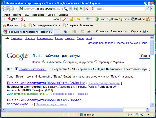 Поиск – для пошуку ресурсів Internet за введеними словами;