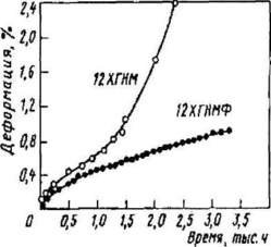 Для многослойных сосудов высокого давления с рабочей температурой до 450 °С применяется сталь 12ХГНМ. Усовершенствование стали 12ХГНМ (введен ванадий и уменьшены концентрации никеля, молибдена и хрома) позволило использовать ее до более высоких температур - 560°С для изготовления сосудов высокого давления в сварном многослойном рулонированном исполнении. На рис.2 приведены кривые ползучести сталей 12ХГНМ и 12ХГНМФ при температуре