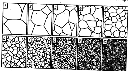 Для определения размера наследственного (аустенитного) зерна применяют различные методы. Например, для низкоуглеродистых цементуемых сталей применяют метод цементации, т.е. науглероживание поверхности стали. При нагреве стали до 930 ±10°C в углеродсодержащей смеси и выдержке при данной температуре в течение 8 ч поверхностный слой ее насыщается углеродом до заэвтектоидного состава. При охлаждении из аустенита выделяется избыточный цементит, который располагается по границам зерен аустенита в виде сетки. После полного охлаждения эта цементитная сетка окружает зерна перлита и показывает размер бывшего при нагреве аустенитного зерна. Подготовленную таким образом структуру стали рассматривают в микроскоп при 100х увеличении, видимые под микроскопом зерна сравнивают с эталонными, предусмотренными стандартной шкалой размеров зерна (рис. 32). Зерна от № 1 до № 4 считают крупными, а с № 5 — мелкими.