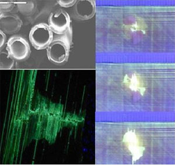 Рис. 1. Полые стеклянные трубки, пронизывающие композитный материал (вверху слева). При повреждении трубки разрушаются, и жидкость растекается, заполняя трещину и затвердевая