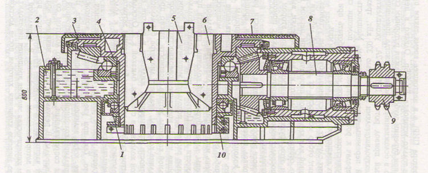 Ротор (рис. 1) состоит из литого стального корпуса 2, во внутренней полости которого на упорном шариковом подшипнике 4 размещен стол 3 с укрепленным с помощью горячей посадки зубчатым коническим венцом. Последний входит в закрепление с конической звездочкой, посаженной на валу 8, вращающемся на двух подшипниках. В нижней части устанавливается вспомогательная опора 1, закрепленная гайкой 10. верхняя часть стола ротора закрывается кольцевым кожухом 7, ограждающим периферическую часть вращающего стола. На консольной части роторного вала смонтировано цепное колесо 9, через которое подводится мощность к ротору.