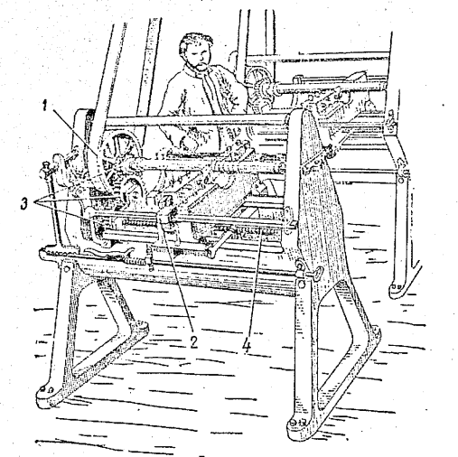 Особенно широко изготовление токарных станков было развито на Тульском и других оружейных заводах. На рис. 3 показан один из таких станков. На нем изделие приводилось во вращение от трансмиссии через ременную передачу 1, а суппорт 2 перемещался механически при помощи шестерен 3 и винта 4.