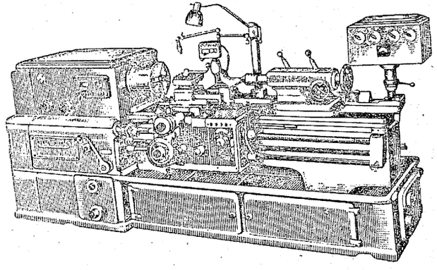 После изобретения и успешного применения быстрорежущей стали, а затем и твердых сплавов появились быстроходные мощные станки современной конструкции. Эти станки имеют массивные станины и снабжены коробками скоростей, позволяющими быструю перемену чисел оборотов обрабатываемого изделия, и более совершенными коробками подач. На рис. 6 показан наиболее совершенный токарно-винторезный станок модель 1620, изготовляемый заводом «Красный пролетарий».