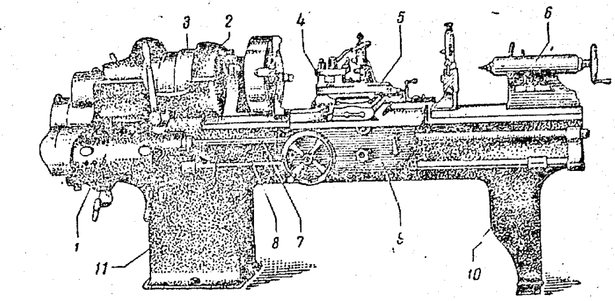 Такой станок, показанный на рис. 5, состоит из коробки подач 1, передней бабки 2, ступенчатого шкива 3, резцедержателя 4, суппорта 5, задней бабки 6, ходового винта 7, ходового валика 8, станины ножки 10, фартука 9 и