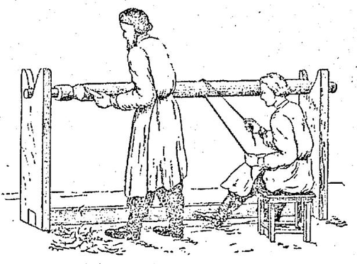 Древний токарный станок ручного привода показан на рис. 1. Обтачиваемое изделие, установленное на двух деревянных стойках, обрабатывали два человека. Один вращал при помощи веревки изделие то вправо, то влево, а другой держал в руках режущий или скоолящии инструмент и обрабатывал им изделие.