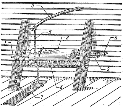 Старинный русский токарный станок ножного привода показан на рис. 2. Этот станок совершеннее предыдущего: более устойчивое взаимное положение изделия и инструмента обеспечивало и более точную обработку, а замена ручного привода ножным позволила работать на станке вместо двух одному человеку. Обтачиваемое изделие устанавливалось на заостренных деревянных клиньях 1 и 2 (первых представителях современных центров). Клин 1 закреплялся в стойке наглухо, а клин передвигался до упора в изделие 3 и закреплялся вспомогательным клином 4, Веревка 5, навитая на изделие 1-2 оборота, одним концом прикреплялась к гибкой жерди 6, а другим — к деревянной подножке 7. Нажимая ногой на подножку, токарь приводил во вращение обтачиваемое изделие. Удерживая обеими руками режущий инструмент, опирающийся о деревянный брусок 8, он прижимал инструмент к изделию и обрабатывал его.