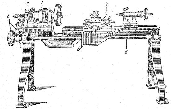 На рис. 4 показан токарный станок со ступенчатым шкивом и перебором, созданный в середине девятнадцатого столетия. На таких станках изделию сообщалось разное число оборотов при помощи ступенчатого шкива 1 и шестеренчатого перебора 2. Движение суппорту 3 передавалось через смежные шестеренки 4 и ходовой валик или винт 5. Подобные токарные станки изготовлялись и в начале ХХ века.