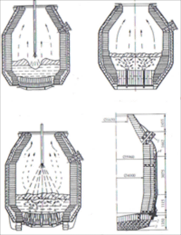 Конвертор – агрегат для виробництва сталі, дія якого полягає в продувці рідкого чавуну киснем. Конвертор представляє собою велику стальну реторту, футеровану вогнетривкими виробами. Форма корпуса грушоподібна, симетрична. Корпус кисневого конвертера складається з днища, нижнього усіченого конуса, циліндричної частини і конічної горловини. Біля основи верхньої конічної частини кожуха конвертора розташовано сталевипускний отвір. Розрізняють конвертори з верхнім дуттям (LD), нижнім (OBM) і комбінованим (ТВМ, LBE) (рис.1.1) [1].