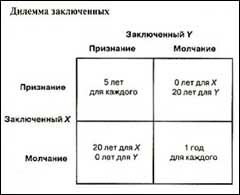 Одним из наиболее часто рассматриваемых примеров, в котором преследование личного интереса обречено на провал, является так называемая "дилемма заключенного". Математику А.В. Такеру приписывают открытие этой простой игры, название которой взято из анекдота, первоначально использованного для ее пояснения. Два заключенных содержатся в разных камерах за тяжелое преступление, которое они совершили. Однако прокурор располагает достаточными уликами, чтобы признать их виновными в совершении менее значительного преступления, за которое предусмотрено наказание, скажем, в 1 год тюремного заключения. Каждому заключенному говорят, что если один из них сознается, то выйдет на свободу, а промолчавший проведет в тюрьме 20 лет. Если сознаются оба, то они получат промежуточный срок, скажем, по 5 лет. Этим двум заключенным не дают возможности общаться друг с другом. Возможные развязки событий приведены в таблице.