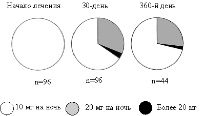 При этом его положительное влияние на качество сна и на дневную работоспособность после 3 недель непрерывного применения не только сохраняется, но даже несколько усиливается [12]. В другом исследовании было проведено лечение 96 пациентов с упорными и хроническими нарушениями сна. 44 из них продолжали прием ивадала в течение года [13]. За этот период у пациентов и врачей не отмечалось потребности в увеличении дозы принимаемого лекарства, и доля пациентов, которые после первого месяца лечения принимали ивадала 20 мг или более, не увеличилась к концу года (рис. 5). Эти данные указывают на низкую вероятность развития толерантности при применении ивадала, что подтверждено результатами специально проведенного исследования[14]. Важно отметить, что в настоящее время рекомендации по длительности приема снотворных и максимальной суточной дозе не позволяют повторить такое исследование.