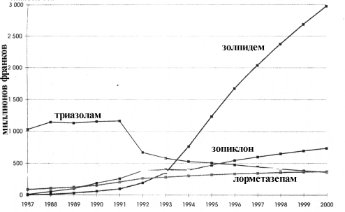 Рис.1 Объем продажи наиболее распространенных в мире снотворных (в миллионах французских франков) миллионов франков