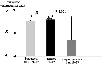 Рис.2 Результаты теста запоминания слов у больных, принимавших золпидем, плацебо и флунитразепам
