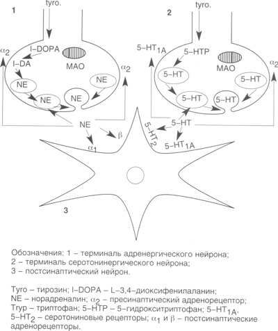 Родоначальником новой группы антидепрессантов с преимущественно рецепторным механизмом действия является миансерин, получивший название атипичного антидепрессанта в связи с отсутствием у него заметного влияния на обратный захват моноаминов и способности ингибировать МАО. Оказалось, что миансерин, как и его аналоги миртазапин и сетиптилин (4-циклические соединения, по структуре напоминающие пиразидол), являются блокаторами альфа2-адренорецепторов, локализованных на пресинаптических окончаниях адрен- и серотонинергических нейронов (см. рисунок). Рецепторы этого типа осуществляют тормозной контроль высвобождения нейромедиаторов, т.е. НА и серотонина, а их блокада ведет к усилению нейропередачи в соответствующих синапсах. В опытах in vitro и in vivo было показано, что миансерин вызывает увеличение пресинаптического выброса НА и устраняет эффект клонидина, агониста альфа2-адренорецепторов. Кроме того, препарат угнетает постсинаптические 5-HT2 серотониновые рецепторы. Характерные побочные эффекты миансерина, такие как ортостатическая гипотензия и седативное действие, связывают с влиянием препарата на альфа1-адрено- и Н1-гистаминовые рецепторы мозга. Один из новых представителей этой группы – нафазодон – наряду с рецепторным действием обладает сродством к серотониновому мембранному транспортеру, что сближает его с веществами группы СИОЗС. Благодаря угнетающему влиянию на постсинаптические 5-HT2-рецепторы препарат обладает анксиолитическим действием, что определяет возможность расширения показаний для его клинического применения при лечении тревожной депрессии. Интересной особенностью нафазодона оказалась его способность в отличие от большинства антидепрессантов увеличивать долю быстроволнового сна и оказывать нормализующее влияние на его структуру, часто нарушенную при депрессии.