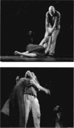 Последняя постановка "Отелло" литовским режиссером Эймунтасом Некрошюсом (Eimuntas Nekrosius) представляет собой достойный пример такой стандартной схемы. Не случайно на роль Дездемоны пригласили известную литовскую балерину Эгле Шпокайте (Egle Spokaite). Задумка режиссера состояла в том, чтобы представить образ Дездемоны как пластический объект, как эстетическое зрелище, доставляющее наслаждение нашему взору. Не случайно также то, что она почти не говорит, а если и говорит, то не в театральной манере (громким звучным голосом), а произнося невнятные утробные звуки. Все, что она говорит, не имеет никакого смысла, все, чем она является, это видимость, красивое тело: такая пластичность обещает безграничную податливость. Небольшие перформансы Дездемоны не связаны с нарративом, который приводится в движение мужскими характерами. Ее представления всего лишь "представления-в-себе", чистая видимость, которая просто требует насилия и контроля. Центральный эпизод спектакля состоит из акта наказания, длинных многословных сцен унижения и насилия, за которыми наконец следует убийство. Каждая сцена насилия уже содержит в себе и взгляд зрителя: этот взгляд (уже включенный в сцену) заменяет нам (как зрителям) наш собственный взгляд. Этот "несущественный взгляд", который невидим для персонажей, но очевиден для зрительного зала, в каком-то смысле отсылает к ob-jet petit а. Взгляд как objet petit а привносит долю случайности и реальности в представление и нарушает последовательность повествования. В то же время взгляд сам становится объектом нашего желания, оно привлекает и контролирует наш взгляд (ил.1,2).