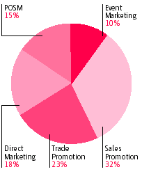 | Consumer Promotion — стимулирование продаж и продвижение товаров, рассчитанные на конечного потребителя, включая: креативные разработки и производство рекламных материалов (creative production); стоимость промоакций и услуг третьих лиц (supplier costs); семплинг (sampling); стоимость призов (incentives) и т. п.; гонорар (комиссия) BTL-агентств (agency fees). Trade Promotion — стимулирование сбытовой сети в целях развития дистрибуции, ускорения оборота и увеличения объема продаж, включая: креативные разработки и производство рекламных материалов, стоимость совместных проектов и услуг третьих лиц (supplier costs); стоимость призов и сувениров; гонорар (комиссия) BTL-агентств (agency fees). Direct Marketing, включая: прямую почтовую и е-mail рекламу (direct mail/email); каталоги; телемаркетинг (telemarketing); интернет (online interactive); телемагазины; SMS и др. средства коммуникации, рассчитанные на отклик или прямые продажи; стоимость разработки креатива ДМ; печать/производство рекламных материалов (print/production); базы данных (list/database services); почтовые и производственные расходы (lettershop/mailing); гонорар (комиссия) ДМ-агентств (agency fees). POSM and In-Store Visual Communications — дизайн и производство рекламных материалов для использования в местах продаж, включая собственное производство и импорт (local production and imports), аренда рекламных конструкций и прочего оборудования (direct response displays and other equipment/signage rental). Event Marketing — специальные мероприятия по продвижению, включая спонсорство, брендинг и PR-поддержку (sponsorships with PR coverage). Источник: РАМУ |