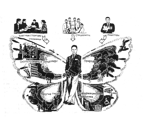 Иными словами, в качестве первоосновы самоорганизации (равно как и воспроизводства социальности как таковой) рассматривается никогда не прекращающийся человеко-средовой метаболизм, в котором и заложены, как представляется, истоки поддержания и обновления всех форм естественной и социокультурной жизни. Именно этой причиной можно объяснить известный в биологии феномен: любой организм жив, пока контактирует со средой; утеря такого контакта означает его гибель. На рисунке 1 эта мысль отражена в метафорическом образе бабочки. Среду символизируют крылья: их нельзя оторвать, не погубив бабочку, но и сами оторванные крылья становятся безжизненными. Этот образ, мне кажется, стоило бы "отпечатать" в сознании лиц, принимающих управленческие, прежде всего градостроительные, решения, которые нередко из-за социальной некомпетентности авторов, разрушают среду обитания людей, нанося тем самым непоправимый ущерб не только "чьей-то", но и собственной жизни.
