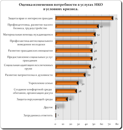 Таким образом, постановка антикризисных целей может стать предметом деятельности благотворительных организаций с задержкой не меньше одного года, а если учесть накопление опыта, которое необходимо для обеспечения эффективности общественных проектов, то и того более.