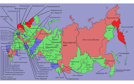 На карте страны обозначены четыре группы субъектов РФ, различающиеся по цвету: «передовики» (10 регионов, рейтинг от 0,75 и выше) – ярко-зеленый; «хорошисты» (47 регионов, от 0,5 до 0,75) – салатовый; «середняки» (21 регион, от 0,35 до 0,5) – розовый; «не реализовавшие свой потенциал» (5 регионов, ниже 0,35)– красный (Рис. 29). Цифры в пределах границ субъектов РФ – это номера краев, областей, республик и иных субъектов.