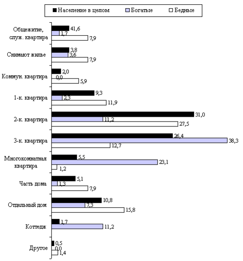 Формируются совершенно различные социальные и социально-психологические типы личности. Противоречия между ними охватывают многообразные стороны жизнедеятельности: труд и сферу трудовой мотивации, материальное положение и в целом качество жизни. В то же время изменения в системе отношений собственности формируют экономическую самостоятельность различных групп граждан, качественно новые трудовые ассоциации, характеризующиеся относительной закрытостью корпораций собственников, акционеров и др. Сегодня наиболее интегральной характеристикой, комплексно; отражающей положение людей в различных подструктурах общества, является материальное положение. Налицо резкое и все усиливающееся расслоение населения страны на значительную группу бедных (около 35%), малообеспеченных (30%) и среднеобеспеченных (21%), высокообеспеченных - около 10% и богатых - 5%. По данным социологических исследований, это соотношение (хотя по регионам оно и колеблется) приводит к социальной поляризации общества и не способствует его интеграции, гармонии и толерантности. Социальная структура современного российского общества носит классово-слоевой характер. Четко выделяется класс собственников и класс наемных работников, которые все еще находятся в процессе становления.