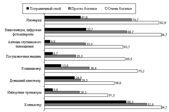 Основные виды имущества, присутствующего у различных слоев богатых, в %