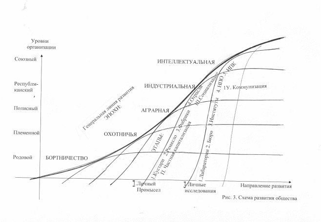 2. Теоретическое обоснование функционирования общества как естественной системы освещается феноменологически в разрезе исторического поэтапного развития, иерархической многоуровневой организации и экономической специализации, что дает возможность выявить систему объективных закономерностей жизнедеятельности общества и предложить инвариантный способ оценки достигнутых результатов с учетом имеющихся возможностей. Гражданство как система видов деятельности приведена на рис. 2. Элементарным объектом общества как системы, функционирующего в среде социума является коллектив. Графическое отображение исторического развития общества “по огибающей кривой” приведено на рис. 3; подобные схемы организационного устройства описываются экспоненциальными зависимостями, а разнообразие специализированных сфер деятельности подчиняется закону нормального распределения. Гражданство как основной общественный институт успешно действует и по народному принципу, но целесообразно его организовать и как властный орган – Совет гражданства.
