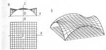 На рис.12 дана схема покрытия, представляющая собой минимальную поверхность с контуром, состоящим из четырёх дуг окружностей. Поверхности этого вида имеют наименьшую площадь при заданном контуре и одинаковую напряжённость в любой точке. Форма поверхности зависит только от формы кривой контура, отдельные её участки имеют положительную и отрицательную переменную кривизну.